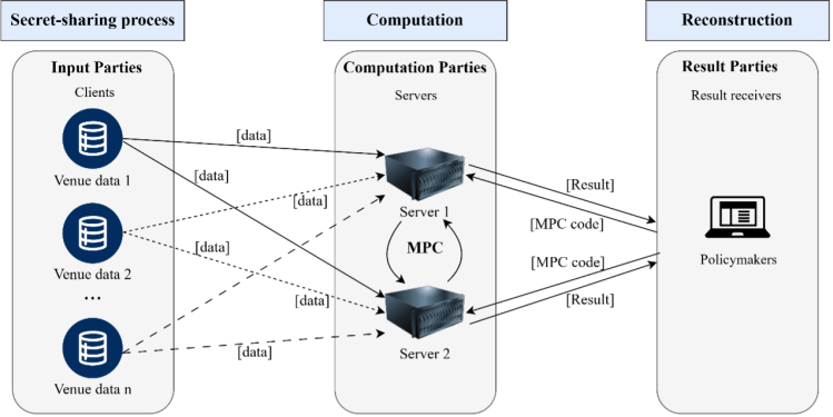 For example, in the Prio+ algorithm, venues, called Prio+ clients, provide data in the form of encrypted “shares” to compute servers, who then collaboratively compute results, such as average revenue, and send this to a result party. The result party never sees the data from which the result is computed.